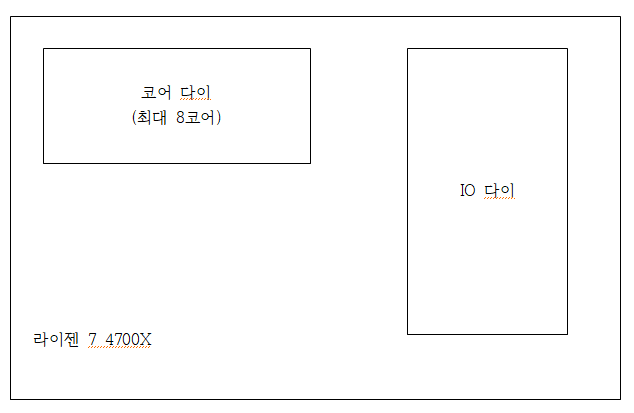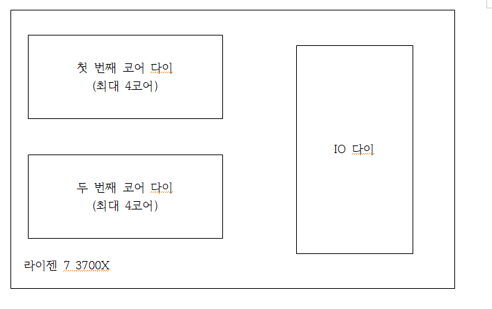 이 구조를 CCX 구조라고 부릅니다. 이 CCX구조에는 코어 다이 두개, IO다이가 한 개 있습니다.