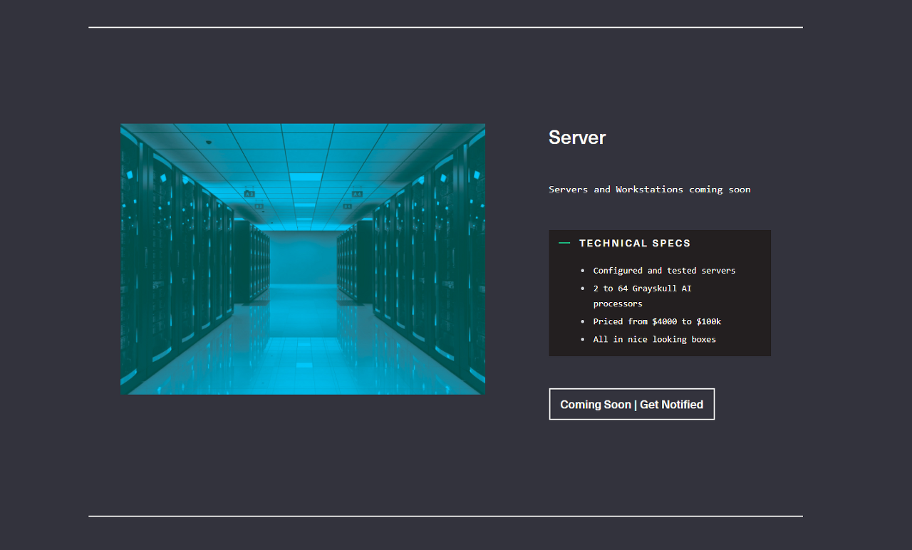 그리고 얘네가 서버도 만든다고 합니다. 2~64개의 그레이스컬 프로세서가 들어가 있다고 하니 만약 AI 디벨로핑을 하시고 서버가 필요하시다면 맞게 구입하시면 될 것 같습니다. 이 서버도 현재 출시는 안 했고 제작 중이라고 합니다.
