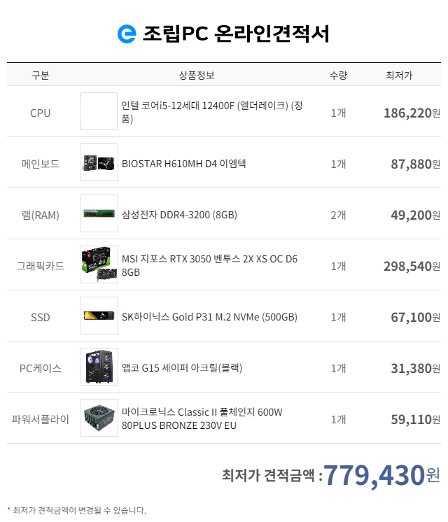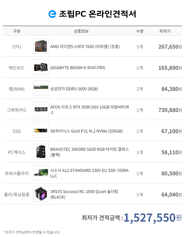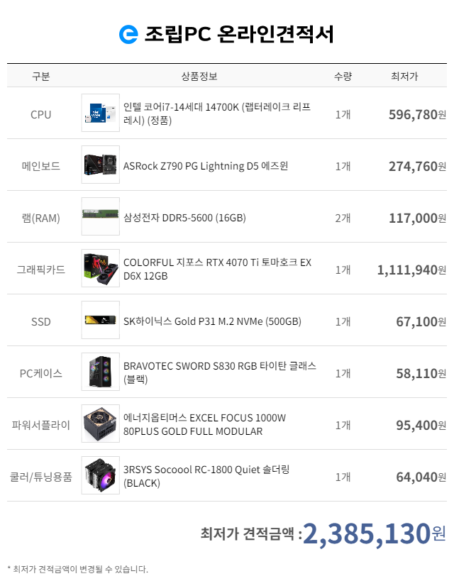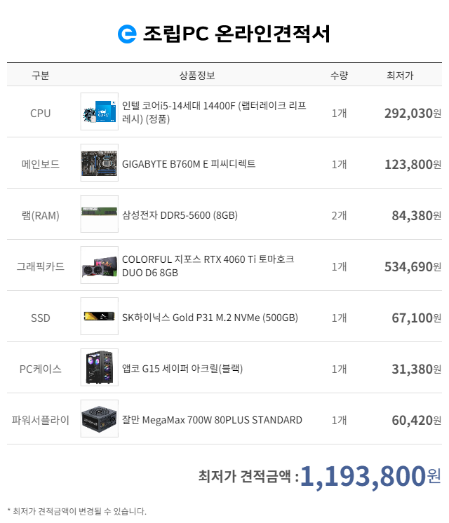 가성비 국민옵션 게이밍용 70만원대 견적입니다