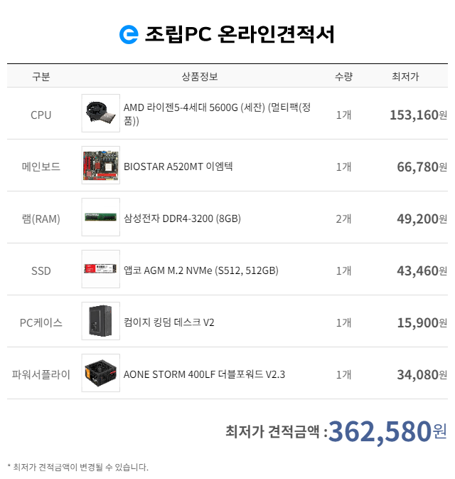 가성비 사무용/라이트 게임용 30만원대 견적입니다