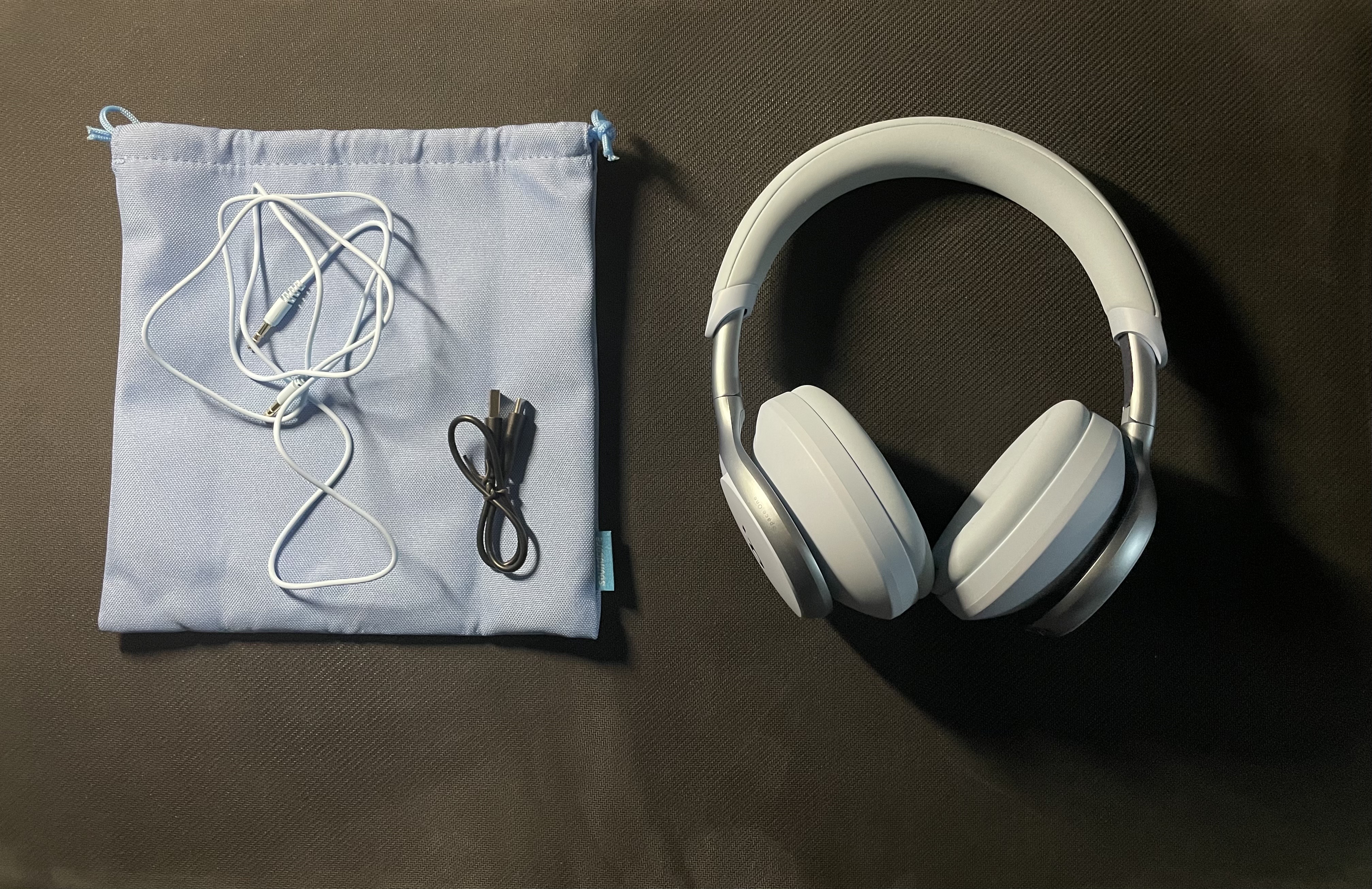구성품은 헤드셋 본체,파우치,aux 케이블,충전 케이블(C타입) 으로 구성되어있습니다. 하드 파우치는 아니지만