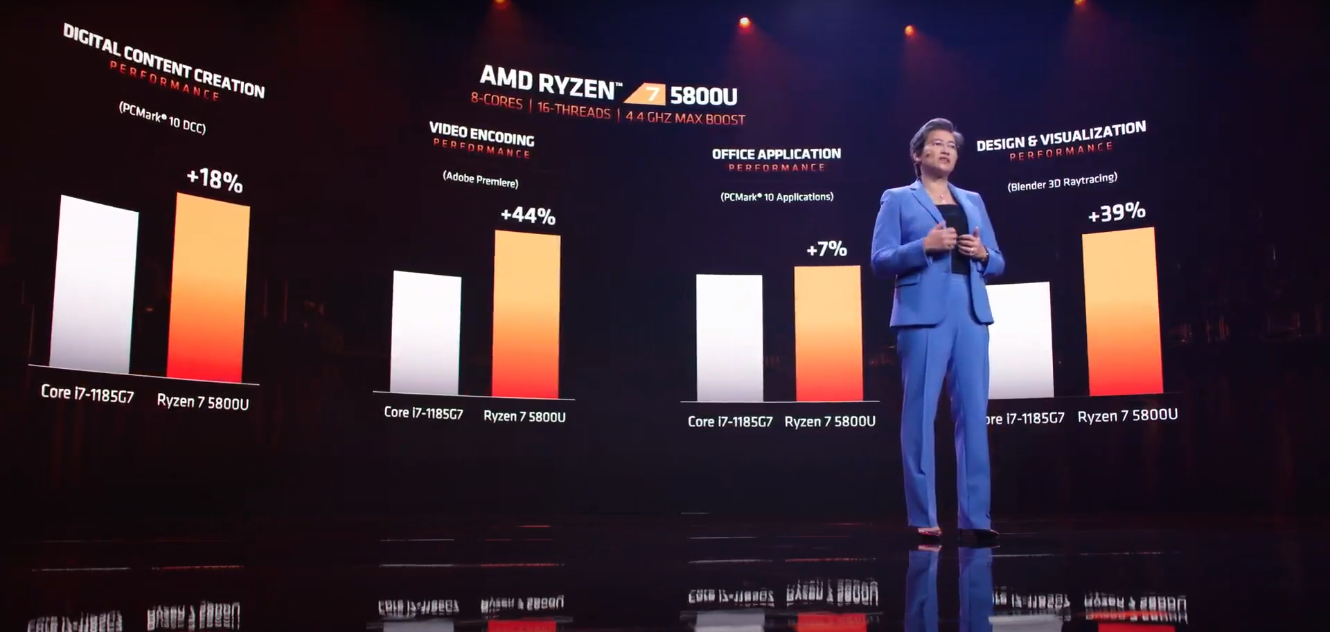 U (저전력)과 HX라인업이 발표되었습니다. 5000번대 모바일 APU는 대표 주자로 5800U가 나와 i7 1185G7과 비교를 했는데, 결과는... 굉장했습니다. 대부분 30% 정도 더 나은 성능을 보여준 것입니다.